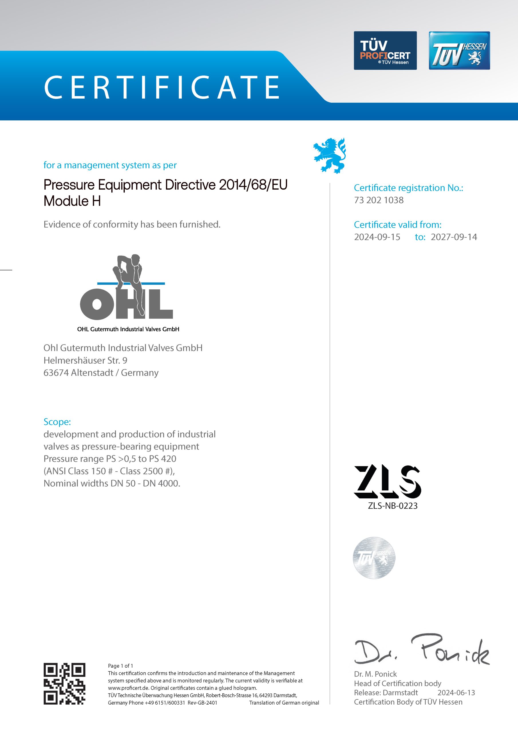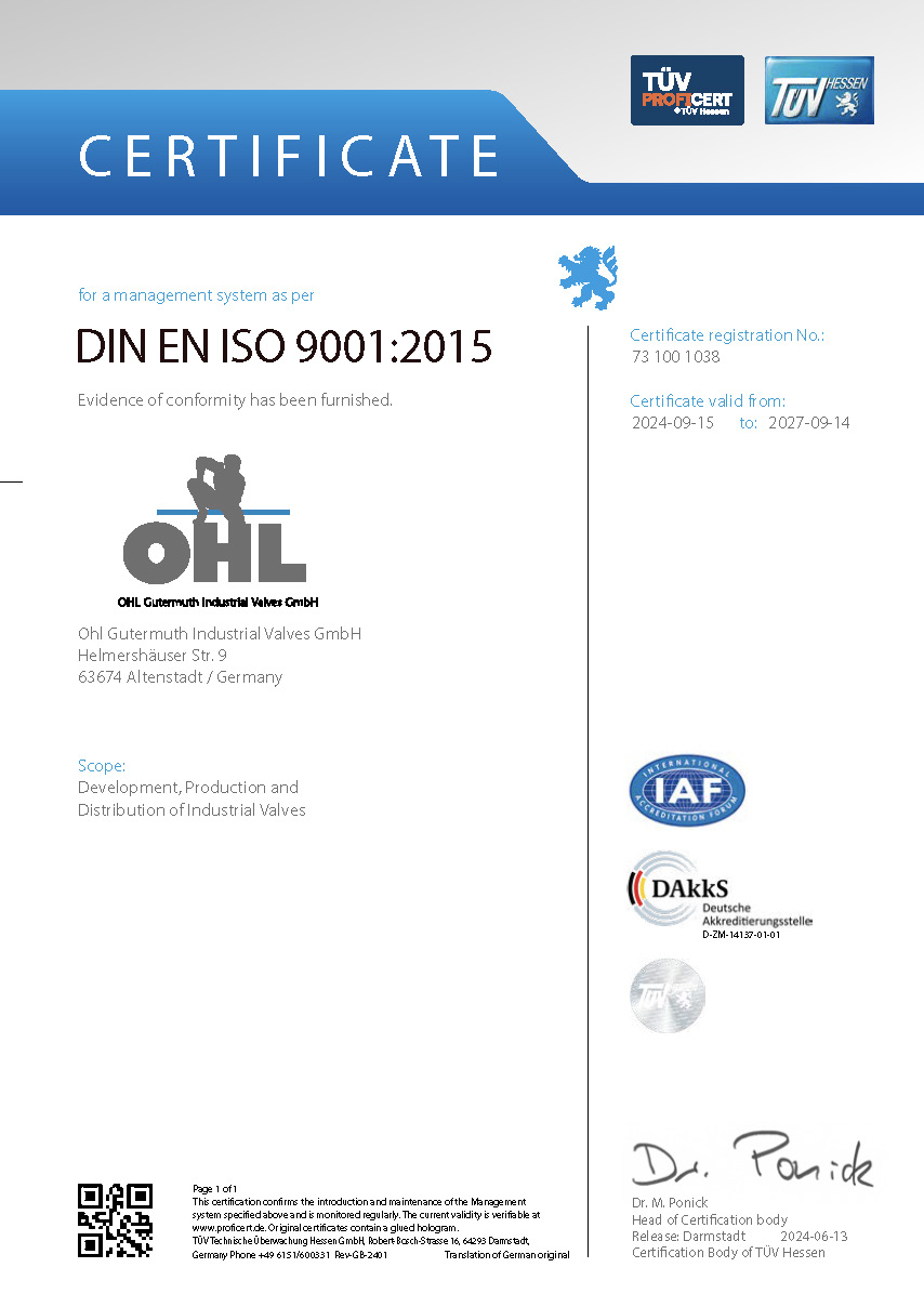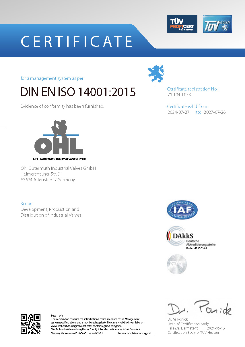 In addition to the usual industry quality standards such as ISO 9001 and DGRL 2014/68/ EU Module H, the integrated management system also includes environmental management in accordance with ISO 14001 and occupational health and safety management. We were one of the first manufacturers of industrial valves to meet the environmental requirements of TA-Luft. We have also obtained Russian approvals such as GOST and RTN for Gazprom.